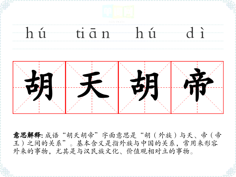 成语“胡天胡帝”字面意思是“胡(外族)与天、帝(帝王)之间的关系”。基本含义是指外族与**的关系,常用来形容外来的事物,尤其是与汉民族文化、价值观相对立的事物。