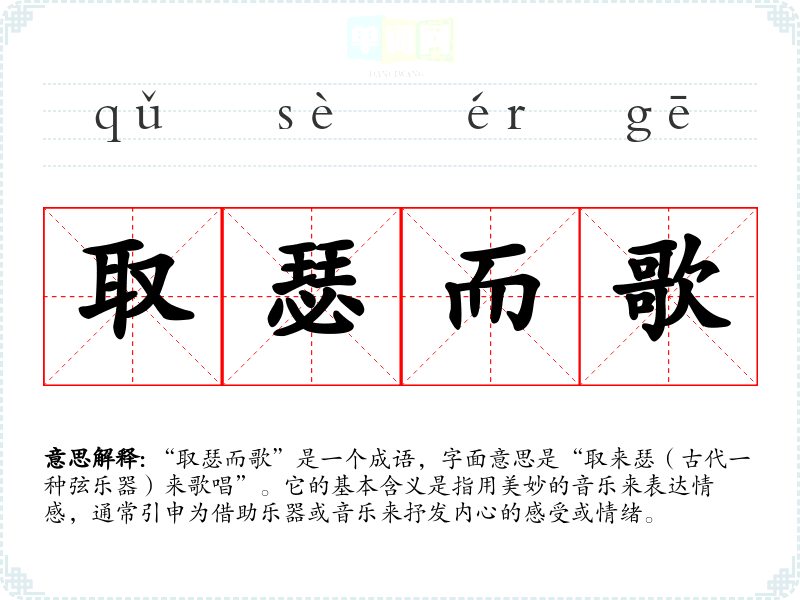 “取瑟而歌”是一个成语,字面意思是“取来瑟(古代一种弦乐器)来歌唱”。它的基本含义是指用美妙的音乐来表达情感,通常引申为借助乐器或音乐来抒发内心的感受或情绪。