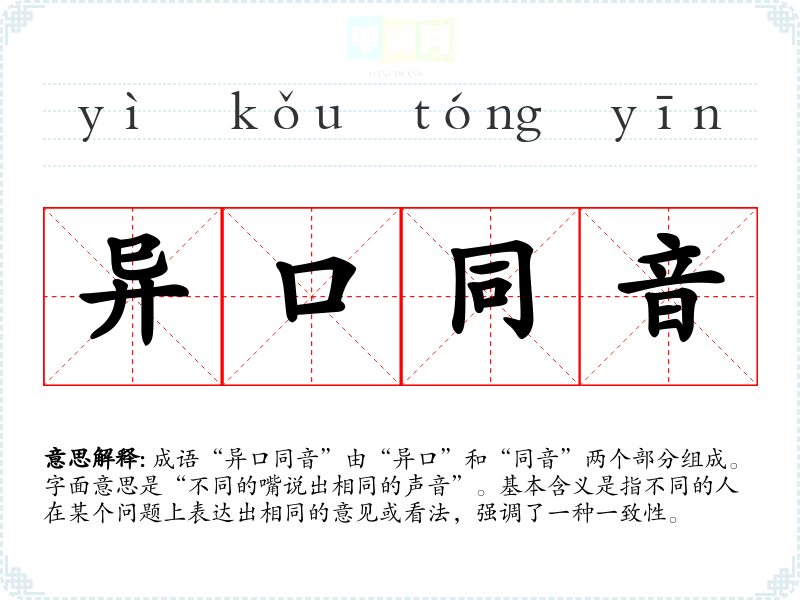 成语“异口同音”由“异口”和“同音”两个部分组成。字面意思是“不同的嘴说出相同的声音”。基本含义是指不同的人在某个问题上表达出相同的意见或看法,强调了一种一致性。