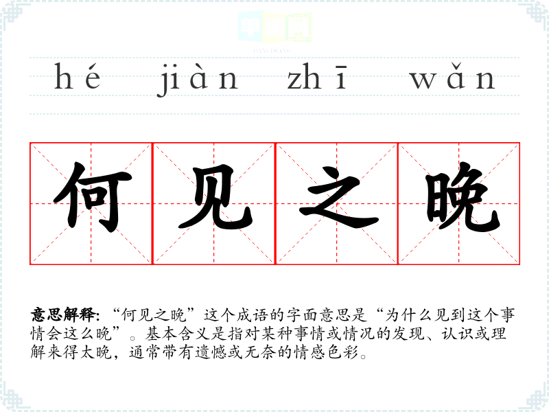 “何见之晚”这个成语的字面意思是“为什么见到这个事情会这么晚”。基本含义是指对某种事情或情况的发现、认识或理解来得太晚,通常带有遗憾或无奈的情感色彩。