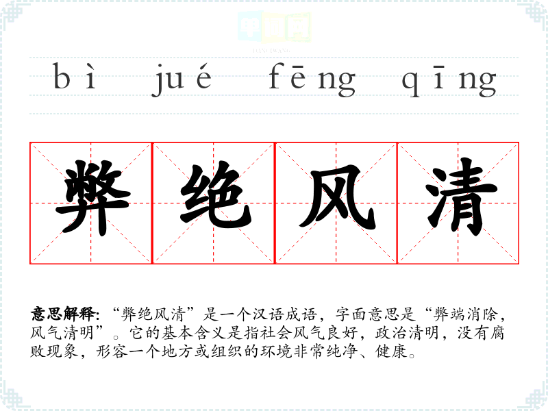 “弊绝风清”是一个汉语成语,字面意思是“弊端消除,风气清明”。它的基本含义是指社会风气良好,政治清明,没有腐败现象,形容一个地方或组织的环境非常纯净、健康。