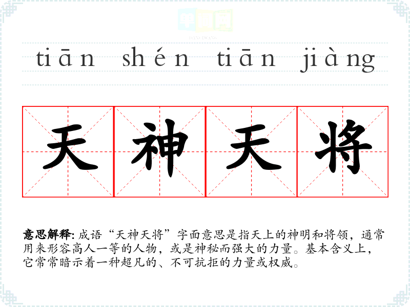 “天神天将”带给我一种崇高和敬畏的感觉。它让我联想到那些在历史上或生活中具有巨大影响力的人物,激励我们追求卓越与非凡。同时,这个成语也提醒我们,身处社会之中,领导与权威并非永恒,需以谦卑与责任心来对待。
