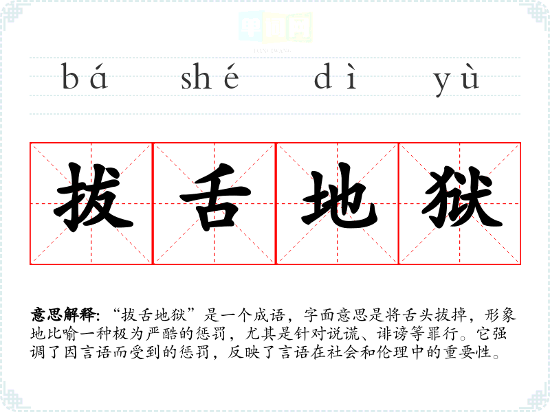 “拔舌地狱”是一个成语,字面意思是将舌头拔掉,形象地比喻一种极为严酷的惩罚,尤其是针对说谎、诽谤等罪行。它强调了因言语而受到的惩罚,反映了言语在社会和伦理中的重要性。
