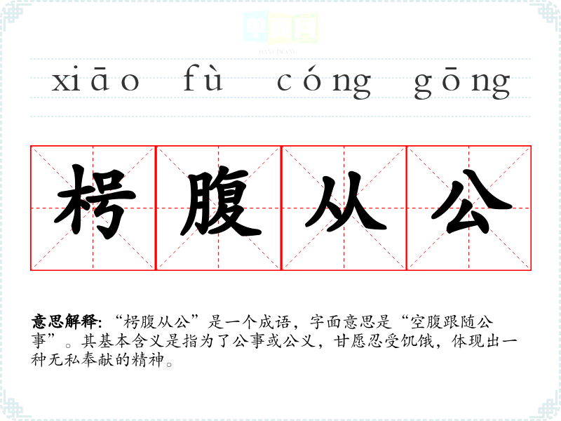 “枵腹从公”是一个成语,字面意思是“空腹跟随公事”。其基本含义是指为了公事或公义,甘愿忍受饥饿,体现出一种无私奉献的精神。