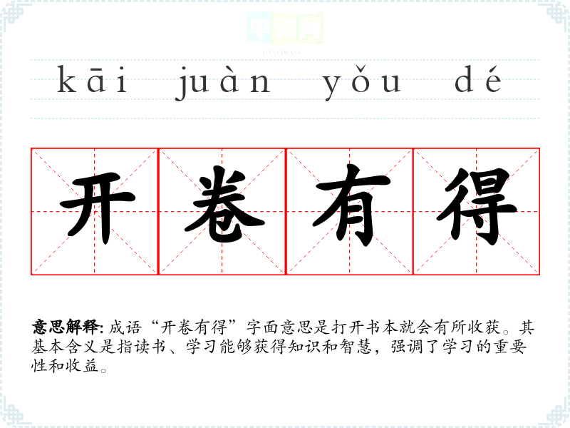 成语“开卷有得”字面意思是打开书本就会有所收获。其基本含义是指读书、学能够获得知识和智慧,强调了学的重要性和收益。