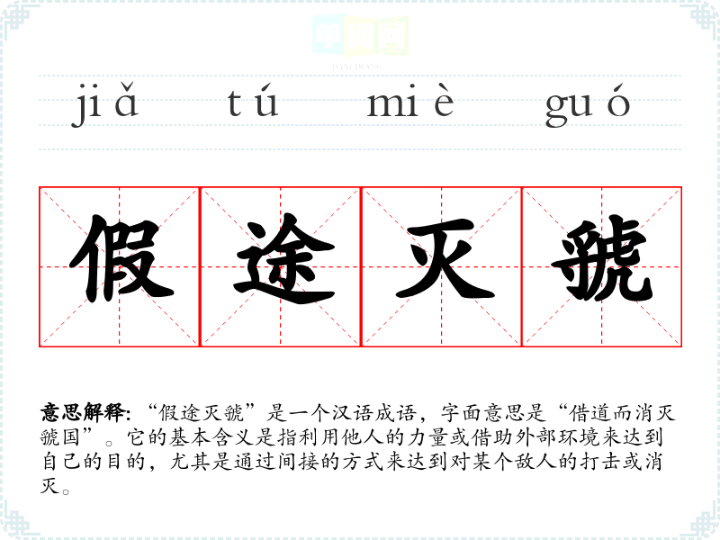“假途灭虢”是一个汉语成语,字面意思是“借道而消灭虢国”。它的基本含义是指利用他人的力量或借助外部环境来达到自己的目的,尤其是通过间接的方式来达到对某个敌人的打击或消灭。