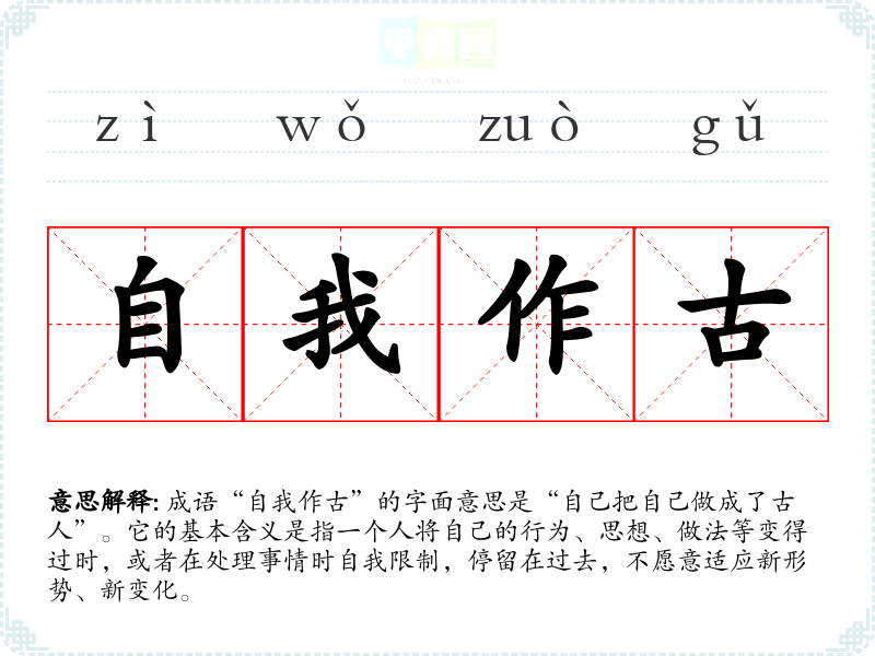 成语“自我作古”的字面意思是“自己把自己做成了古人”。它的基本含义是指一个人将自己的行为、思想、做法等变得过时,或者在处理事情时自我限制,停留在过去,不愿意适应新形势、新变化。