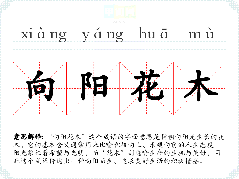 “向阳花木”这个成语的字面意思是指朝向阳光生长的花木。它的基本含义通常用来比喻积极向上、乐观向前的人生态度。阳光象征着希望与光明,而“花木”则隐喻生命的生机与美好,因此这个成语传达出一种向阳而生、追求美好生活的积极情感。