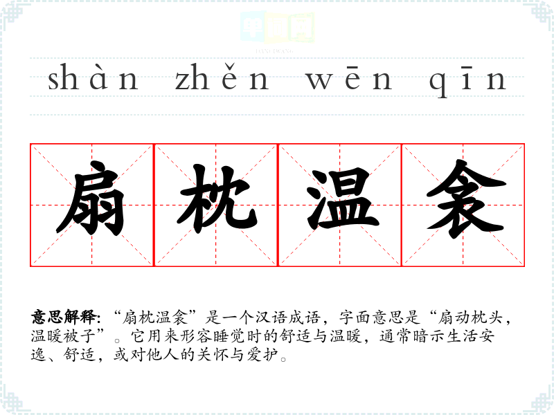 “扇枕温衾”是一个汉语成语,字面意思是“扇动枕头,温暖被子”。它用来形容睡觉时的舒适与温暖,通常暗示生活安逸、舒适,或对他人的关怀与爱护。