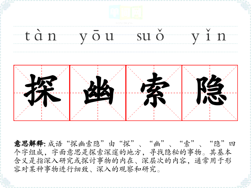 成语“探幽索隐”由“探”、“幽”、“索”、“隐”四个字组成,字面意思是探索深邃的地方,寻找隐秘的事物。其基本含义是指深入研究或探讨事物的内在、深层次的内容,通常用于形容对某种事物进行细致、深入的观察和研究。