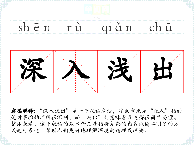 “深入浅出”是一个汉语成语,字面意思是“深入”指的是对事物的理解很深刻,而“浅出”则意味着表达得很简单易懂。整体来看,这个成语的基本含义是指将复杂的内容以简单明了的方式进行表达,帮助人们更好地理解深奥的道理或理论。