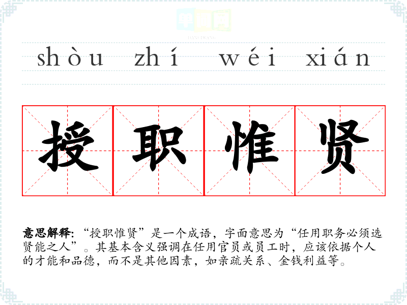 “授职惟贤”是一个成语,字面意思为“任用职务必须选贤能之人”。其基本含义强调在任用官员或员工时,应该依据个人的才能和品德,而不是其他因素,如亲疏关系、金钱利益等。
