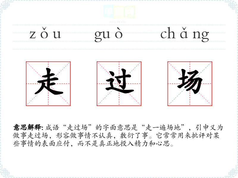 成语“走过场”的字面意思是“走一遍场地”,引申义为做事走过场,形容做事情不认真,敷衍了事。它常常用来批评对某些事情的表面应付,而不是真正地投入精力和心思。