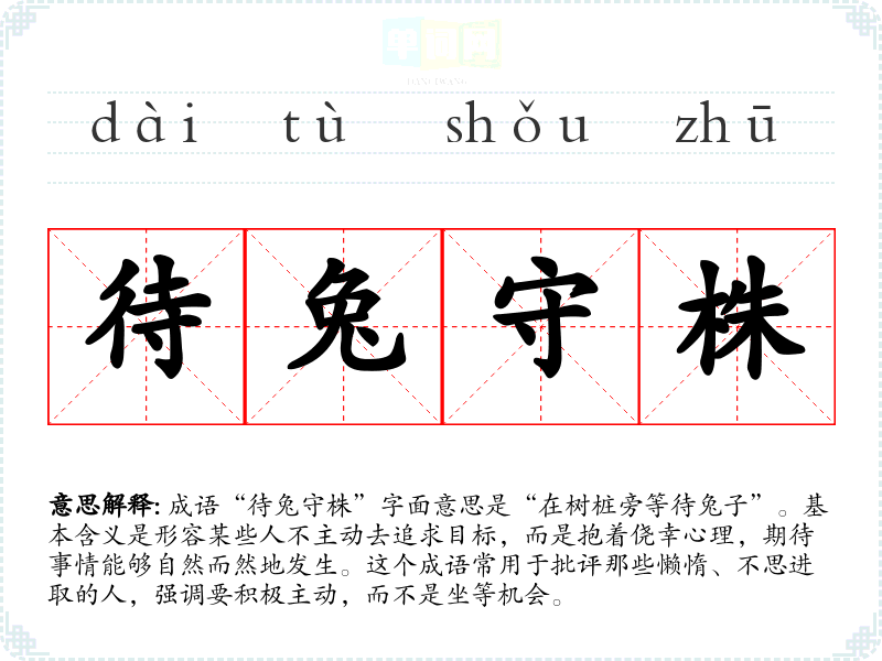 成语“待兔守株”字面意思是“在树桩旁等待兔子”。基本含义是形容某些人不主动去追求目标,而是抱着侥幸心理,期待事情能够自然而然地发生。这个成语常用于批评那些懒惰、不思进取的人,强调要积极主动,而不是坐等机会。