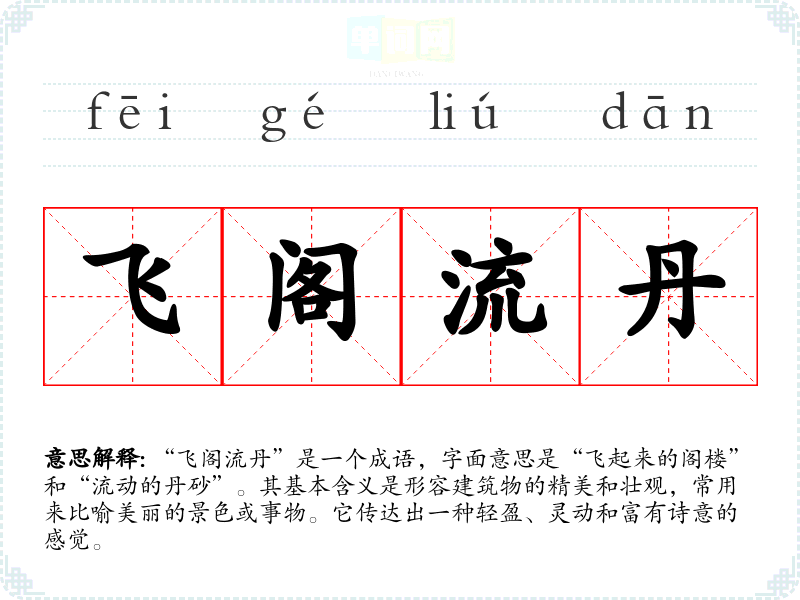 | 飞阁流丹 | 飞阁:架空建造的阁道;流丹:彩饰的漆鲜艳欲流。凌空建造的阁道涂有鲜艳欲流的丹漆。形容建筑物的精巧美丽。 |