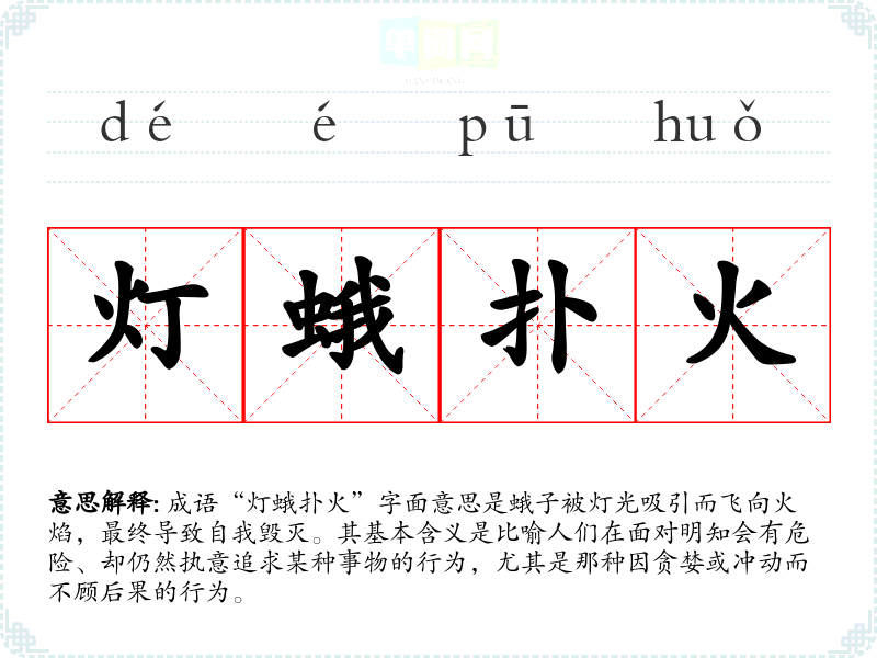 在**文化中,灯蛾扑火的情形常常被用作警示,尤其是在现代社会,面对各种诱惑(如金钱、权力、名声等),此成语提醒人们保持理智,避免因一时冲动陷入困境,具有深刻的现实意义。