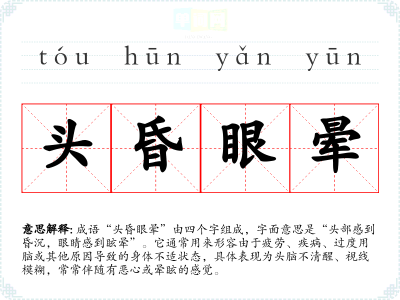 成语“头昏眼晕”由四个字组成,字面意思是“头部感到昏沉,眼睛感到眩晕”。它通常用来形容由于疲劳、疾病、过度用脑或其他原因导致的身体不适状态,具体表现为头脑不清醒、视线模糊,常常伴随有恶心或晕眩的感觉。