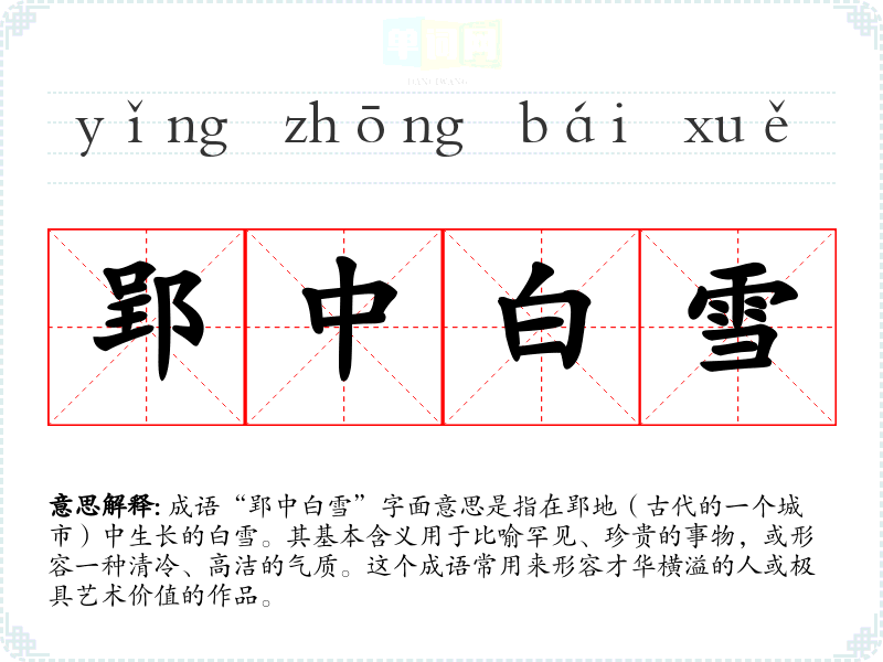 成语“郢中白雪”字面意思是指在郢地(古代的一个城市)中生长的白雪。其基本含义用于比喻罕见、珍贵的事物,或形容一种清冷、高洁的气质。这个成语常用来形容才华横溢的人或极具艺术价值的作品。