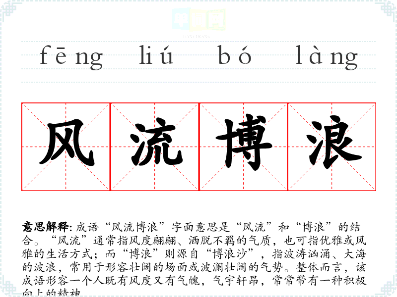 成语“风流博浪”字面意思是“风流”和“博浪”的结合。“风流”通常指风度翩翩、洒脱不羁的气质,也可指优雅或风雅的生活方式;而“博浪”则源自“博浪沙”,指波涛汹涌、大海的波浪,常用于形容壮阔的场面或波澜壮阔的气势。整体而言,该成语形容一个人既有风度又有气魄,气宇轩昂,常常带有一种积极向上的精神。