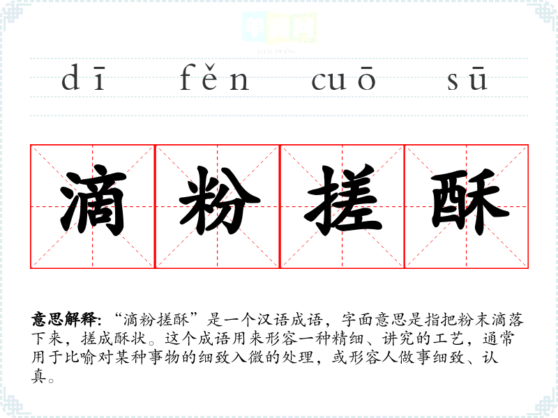“滴粉搓酥”是一个汉语成语,字面意思是指把粉末滴落下来,搓成酥状。这个成语用来形容一种精细、讲究的工艺,通常用于比喻对某种事物的细致入微的处理,或形容人做事细致、认真。