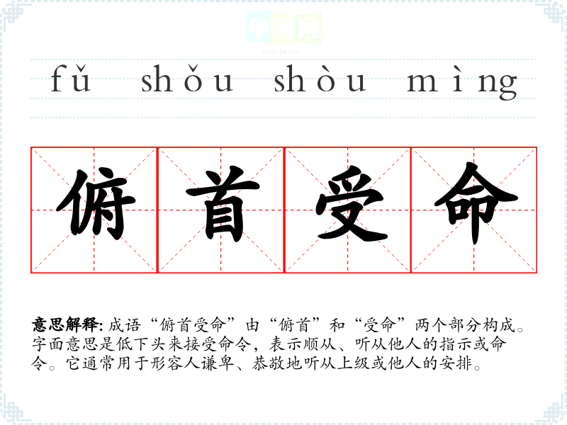 成语“俯首受命”由“俯首”和“受命”两个部分构成。字面意思是低下头来接受命令,表示顺从、听从他人的指示或命令。它通常用于形容人谦卑、恭敬地听从上级或他人的安排。