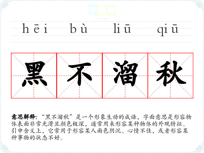“黑不溜秋”是一个形象生动的成语,字面意思是形容物体表面非常光滑且颜色极深,通常用来形容某种物体的外观特征。引申含义上,它常用于形容某人面色阴沉、心情不佳,或者形容某种事物的状态不好。