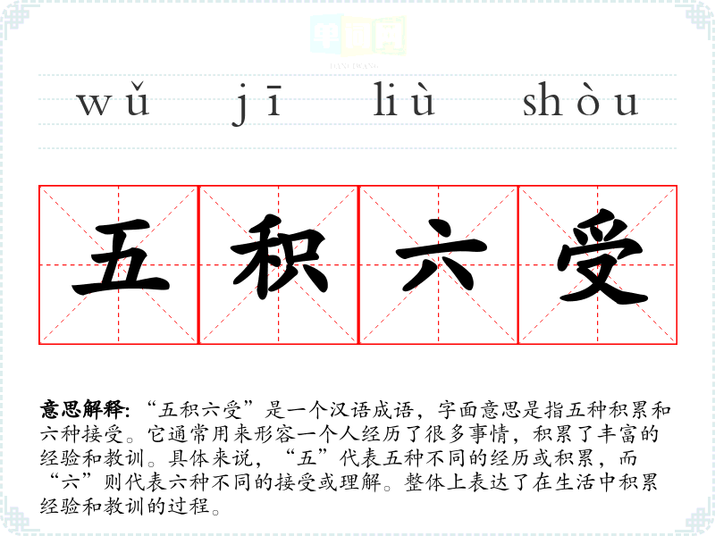 “五积六受”是一个汉语成语,字面意思是指五种积累和六种接受。它通常用来形容一个人经历了很多事情,积累了丰富的经验和教训。具体来说,“五”代表五种不同的经历或积累,而“六”则代表六种不同的接受或理解。整体上表达了在生活中积累经验和教训的过程。