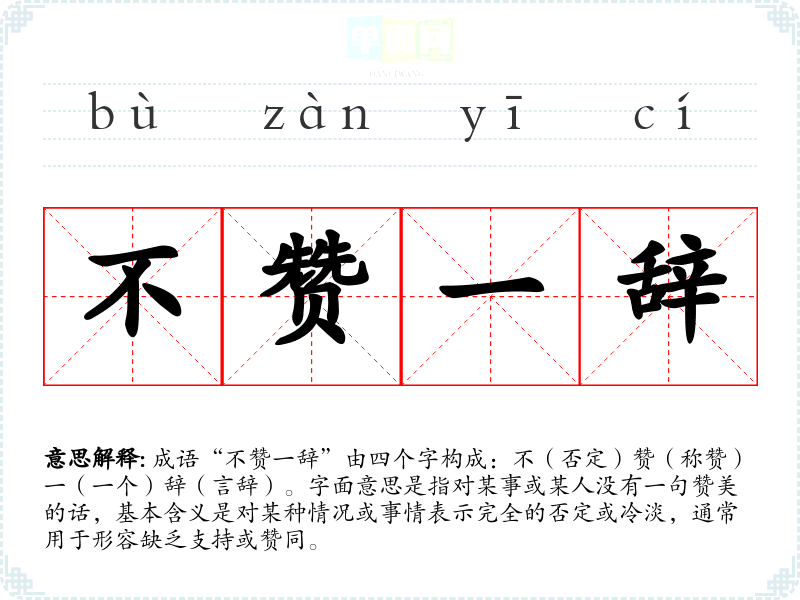 成语“不赞一辞”由四个字构成:不(否定)赞(称赞)一(一个)辞(言辞)。字面意思是指对某事或某人没有一句赞美的话,基本含义是对某种情况或事情表示完全的否定或冷淡,通常用于形容缺乏支持或赞同。
