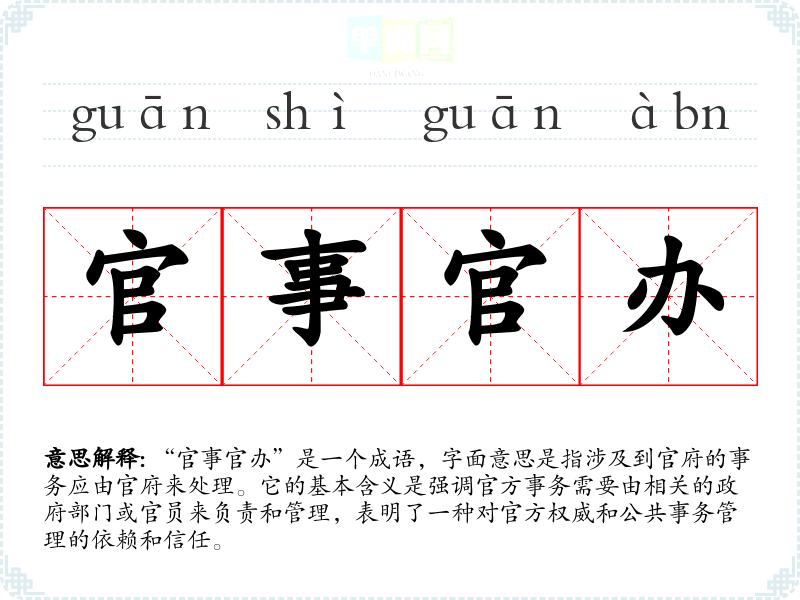 “官事官办”是一个成语,字面意思是指涉及到官府的事务应由官府来处理。它的基本含义是强调官方事务需要由相关的政府部门或官员来负责和管理,表明了一种对官方权威和公共事务管理的依赖和信任。
