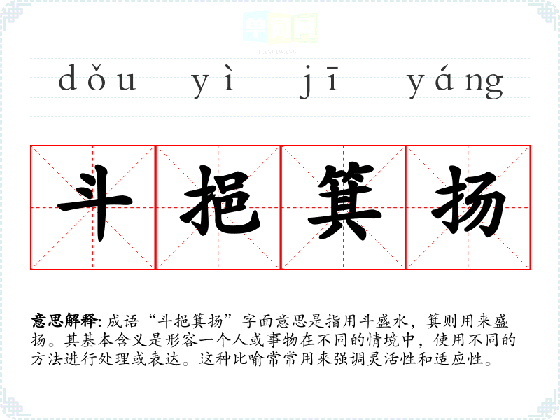 成语“斗挹箕扬”字面意思是指用斗盛水,箕则用来盛扬。其基本含义是形容一个人或事物在不同的情境中,使用不同的方法进行处理或表达。这种比喻常常用来强调灵活性和适应性。