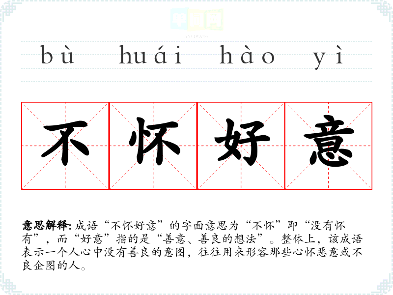 成语“不怀好意”的字面意思为“不怀”即“没有怀有”,而“好意”指的是“善意、善良的想法”。整体上,该成语表示一个人心中没有善良的意图,往往用来形容那些心怀恶意或不良企图的人。