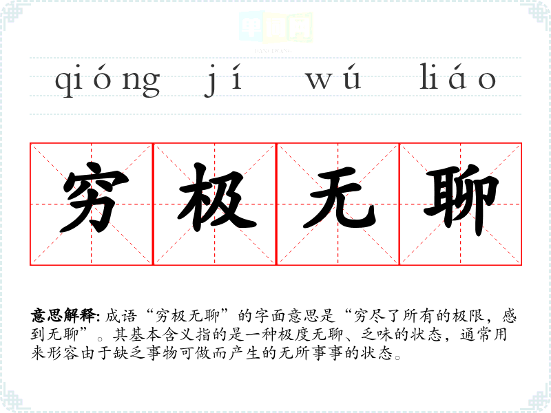 成语“穷极无聊”的字面意思是“穷尽了所有的极限,感到无聊”。其基本含义指的是一种极度无聊、乏味的状态,通常用来形容由于缺乏事物可做而产生的无所事事的状态。