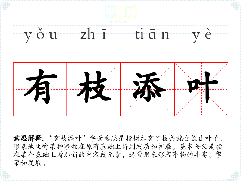 “有枝添叶”字面意思是指树木有了枝条就会长出叶子,形象地比喻某种事物在原有基础上得到发展和扩展。基本含义是指在某个基础上增加新的内容或元素,通常用来形容事物的丰富、繁荣和发展。