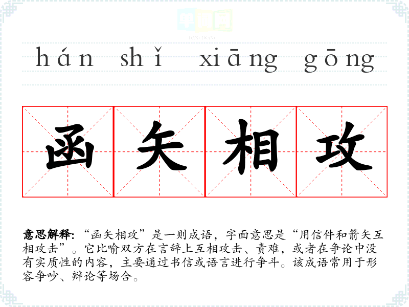 - 反义成语:和气生财、和谐共处。这些成语强调了友好和谐的交流方式,与“函矢相攻”形成鲜明对比。