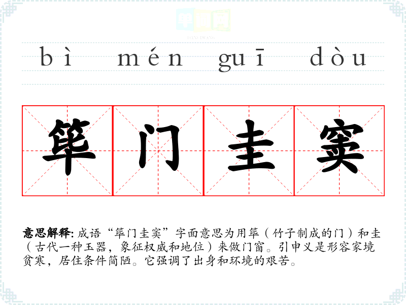 成语“筚门圭窦”字面意思为用筚(竹子制成的门)和圭(古代一种玉器,象征权威和地位)来做门窗。引申义是形容家境贫寒,居住条件简陋。它强调了出身和环境的艰苦。