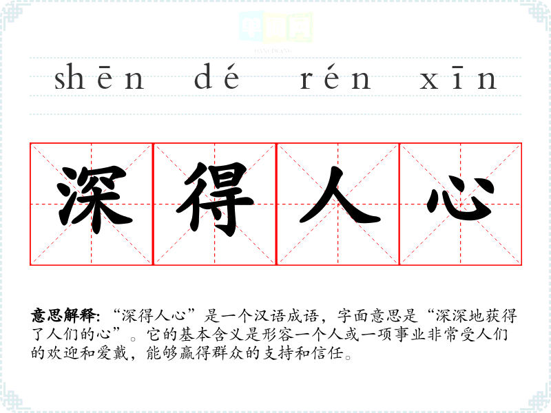 “深得人心”是一个汉语成语,字面意思是“深深地获得了人们的心”。它的基本含义是形容一个人或一项事业非常受人们的欢迎和爱戴,能够赢得群众的支持和信任。