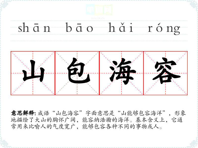 成语“山包海容”字面意思是“山能够包容海洋”,形象地描绘了大山的胸怀广阔,能容纳浩瀚的海洋。基本含义上,它通常用来比喻人的气度宽广,能够包容各种不同的事物或人。