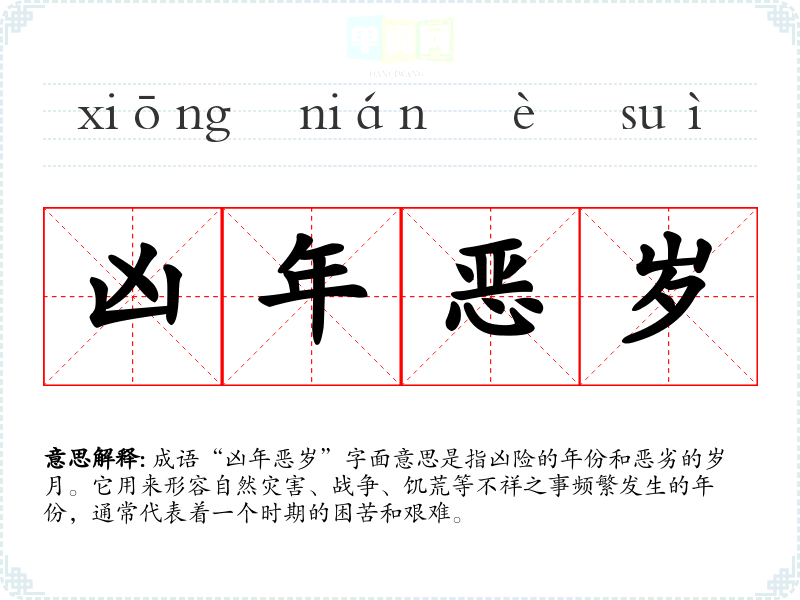 成语“凶年恶岁”字面意思是指凶险的年份和恶劣的岁月。它用来形容自然灾害、战争、饥荒等不祥之事频繁发生的年份,通常代表着一个时期的困苦和艰难。