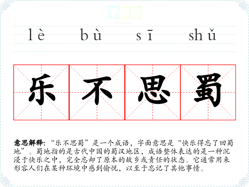 “乐不思蜀”是一个成语,字面意思是“快乐得忘了回蜀地”。蜀地指的是古代**的蜀汉地区,成语整体表达的是一种沉浸于快乐之中,完全忘却了原本的故乡或责任的状态。它通常用来形容人们在某种环境中感到愉悦,以至于忘记了其他事情。