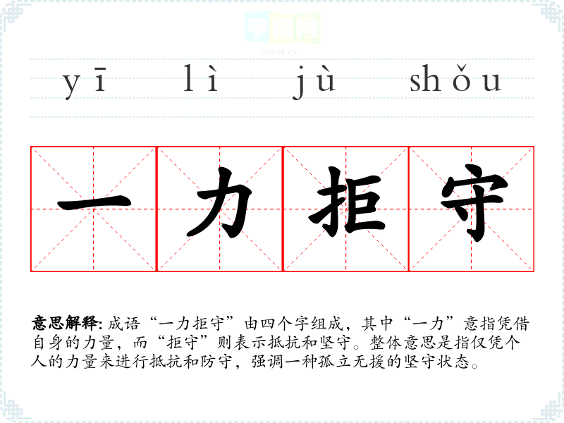 成语“一力拒守”由四个字组成,其中“一力”意指凭借自身的力量,而“拒守”则表示抵抗和坚守。整体意思是指仅凭个人的力量来进行抵抗和防守,强调一种孤立无援的坚守状态。