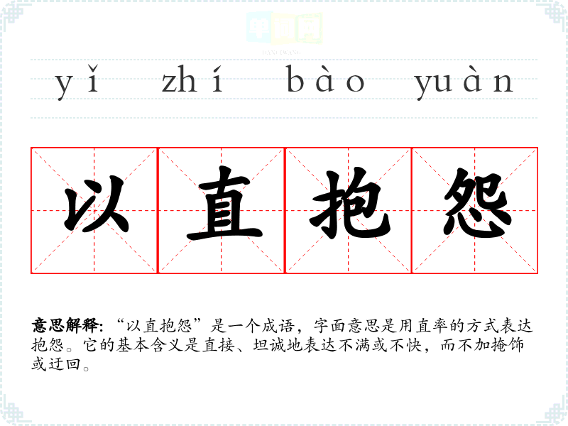 “以直抱怨”是一个成语,字面意思是用直率的方式表达抱怨。它的基本含义是直接、坦诚地表达不满或不快,而不加掩饰或迂回。