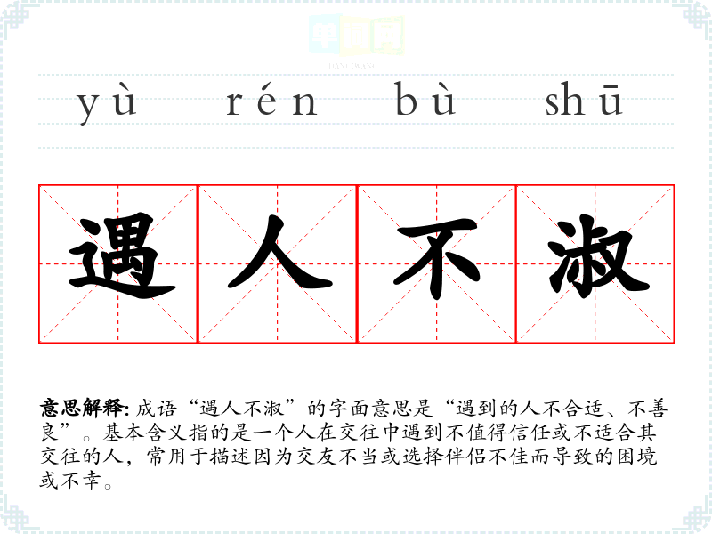 成语“遇人不淑”的字面意思是“遇到的人不合适、不善良”。基本含义指的是一个人在交往中遇到不值得信任或不适合其交往的人,常用于描述因为交友不当或选择伴侣不佳而导致的困境或不幸。