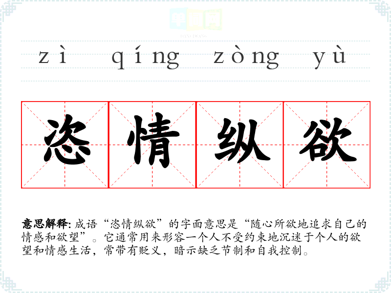 成语“恣情纵欲”的字面意思是“随心所欲地追求自己的情感和欲望”。它通常用来形容一个人不受约束地沉迷于个人的欲望和情感生活,常带有贬义,暗示缺乏节制和自我控制。