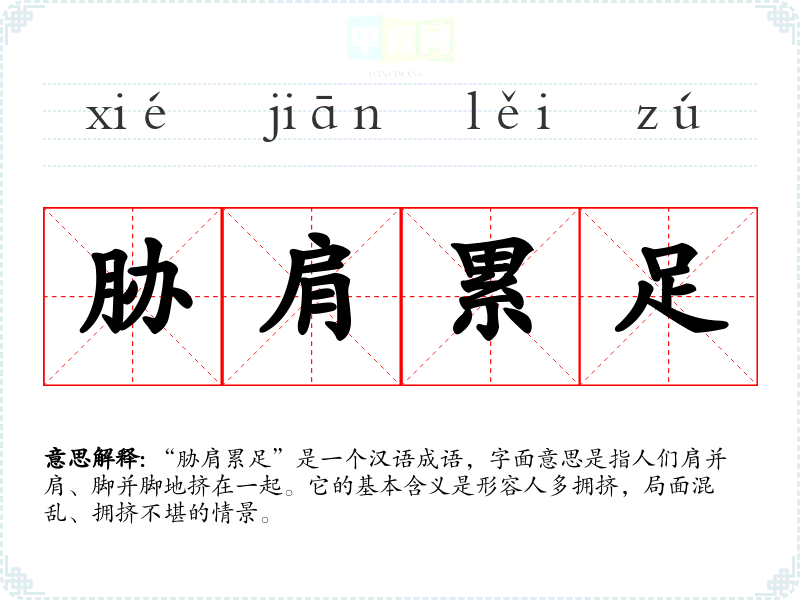 “胁肩累足”是一个汉语成语,字面意思是指人们肩并肩、脚并脚地挤在一起。它的基本含义是形容人多拥挤,局面混乱、拥挤不堪的情景。