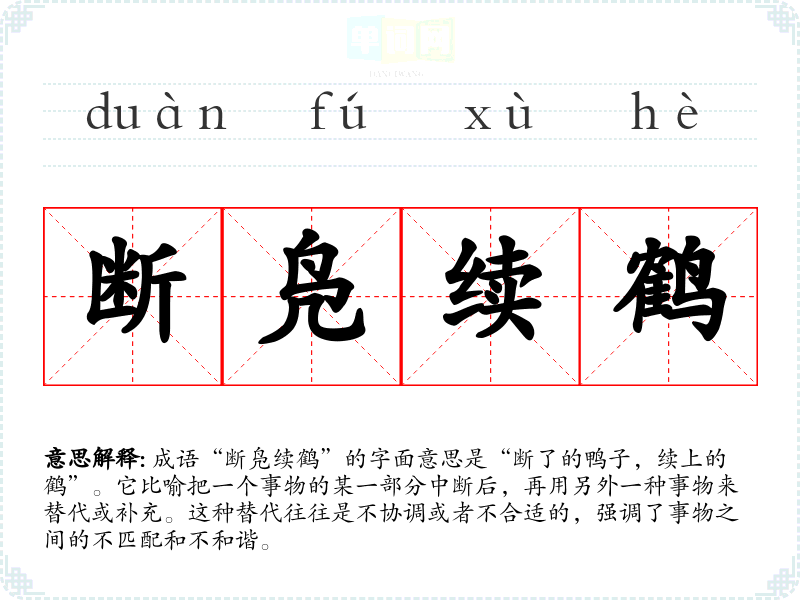 成语“断凫续鹤”的字面意思是“断了的鸭子,续上的鹤”。它比喻把一个事物的某一部分中断后,再用另外一种事物来替代或补充。这种替代往往是不协调或者不合适的,强调了事物之间的不匹配和不和谐。