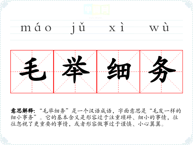 “毛举细务”是一个汉语成语,字面意思是“毛发一样的细小事务”。它的基本含义是形容过于注重琐碎、细小的事情,往往忽视了更重要的事情,或者形容做事过于谨慎、小心翼翼。