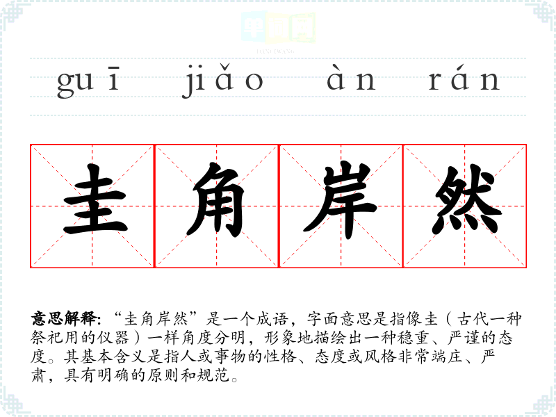 “圭角岸然”是一个成语,字面意思是指像圭(古代一种祭祀用的仪器)一样角度分明,形象地描绘出一种稳重、严谨的态度。其基本含义是指人或事物的性格、态度或风格非常端庄、严肃,具有明确的原则和规范。