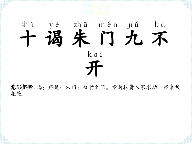 | 十谒朱门九不开 | 谒:拜见;朱门:权贵之门。指向权贵人家求助,经常被拒绝。 |