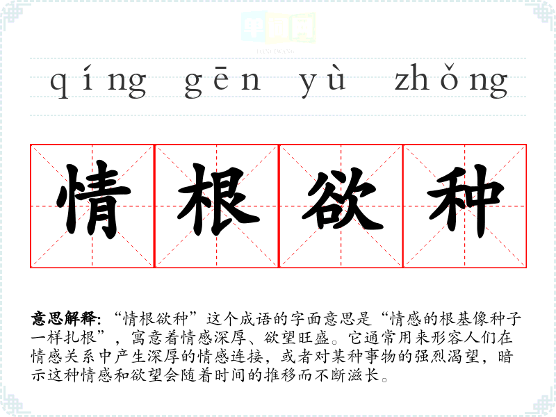 “情根欲种”这个成语的字面意思是“情感的根基像种子一样扎根”,寓意着情感深厚、欲望旺盛。它通常用来形容人们在情感关系中产生深厚的情感连接,或者对某种事物的强烈渴望,暗示这种情感和欲望会随着时间的推移而不断滋长。