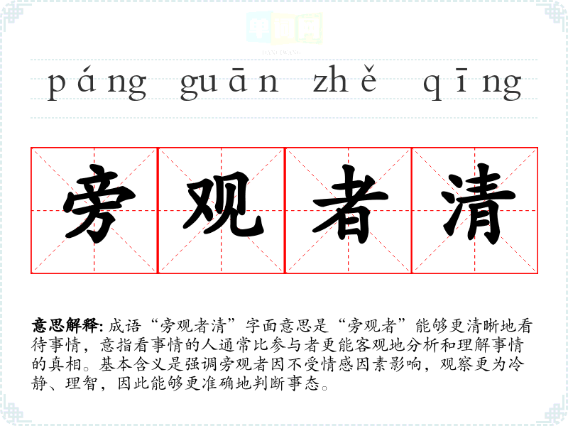 成语“旁观者清”字面意思是“旁观者”能够更清晰地看待事情,意指看事情的人通常比参与者更能客观地分析和理解事情的真相。基本含义是强调旁观者因不受情感因素影响,观察更为冷静、理智,因此能够更准确地判断事态。
